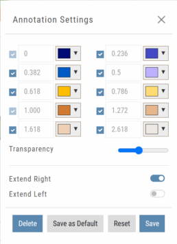 The Fibonacci Annotation has been enhanced to allow you to select which Retracement Levels you want to view in addition to adjusting the color for each as well as transparency overall.