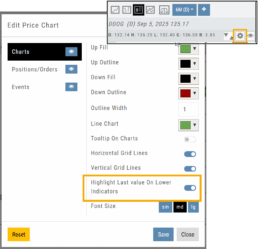 Toggle switch on/off to show/hide last value of certain lower indicators.
